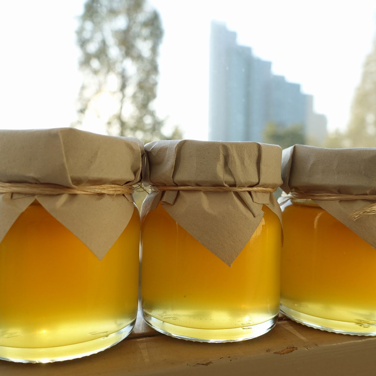 ここで販売しているのは、調査の中で出会った養蜂家から仕入れたハチミツと北九大で採蜜したものです。とくにこの北九大のハチミツは、12月に採蜜された「冬蜜」と呼ばれるキャラメル状の蜜で、糖度80度を超える最高品質のものです。この蜜も気温が上昇すると、結晶が溶け液状になります。キャラメル状に結晶化する条件は不明で、現在研究中です。また、ビンの上部に、白い泡が残っている場合がございます。これはキャラメル状の冬蜜が再融化した際にできた空気の泡で、発酵によるものではありません。時間がたてば少しずつ消えていきますが、普通に食して頂いて問題はありません。